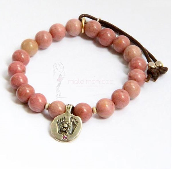 Bracelet stardust en rhodocrosite de Catherine Michiels avec le charm bouddha’s feet et son saphir rose