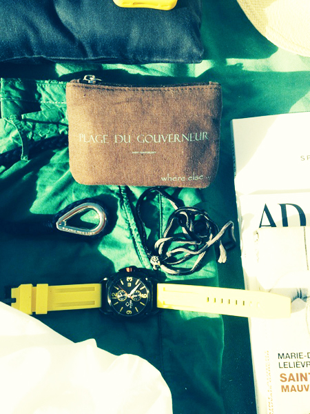 C’est à Saint-Barth que Baptiste nous a vidé son sac de plage. Et oui, ce sont encore les vacances pour certains ! Sur sa fouta turquoise, Baptiste nous fait découvrir le contenu de son sac de vacances.