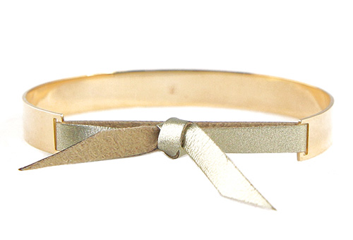 Elle a choisi le collier Apache, le bracelet Gingko et le jonc plaqué or version XXL avec son lien en cuir doré.
