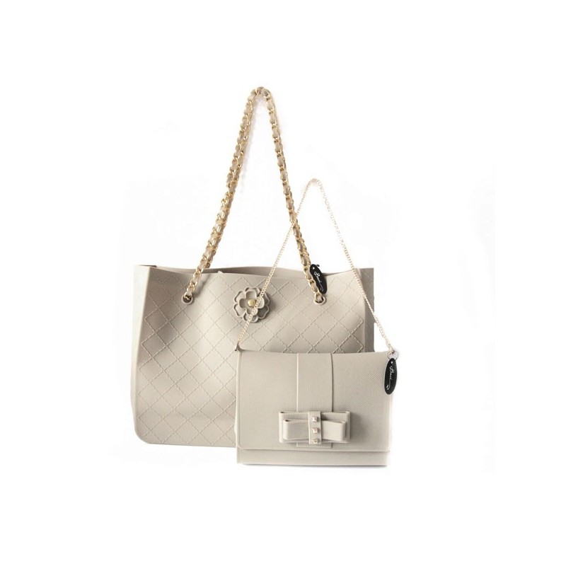 Ce ravissant cabas de Baci en silicone taupe matelassé et ses deux anses en chaîne métallique dorée possède des allures de cabas Chanel, non ?