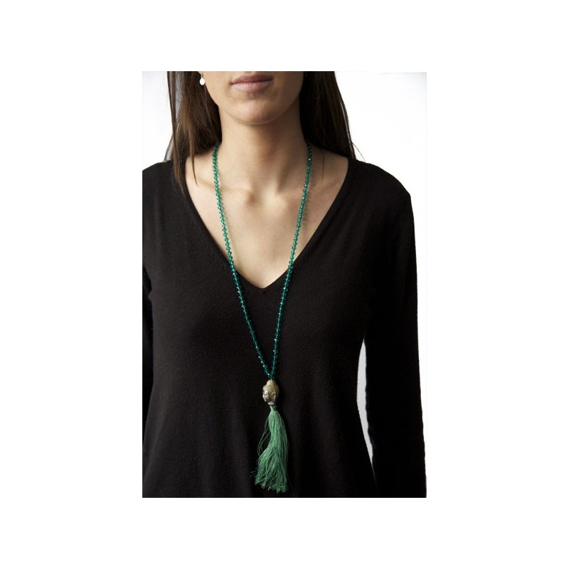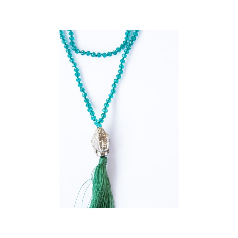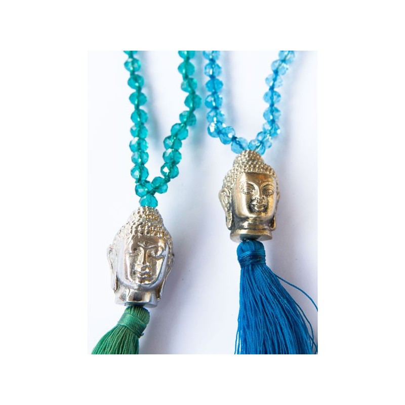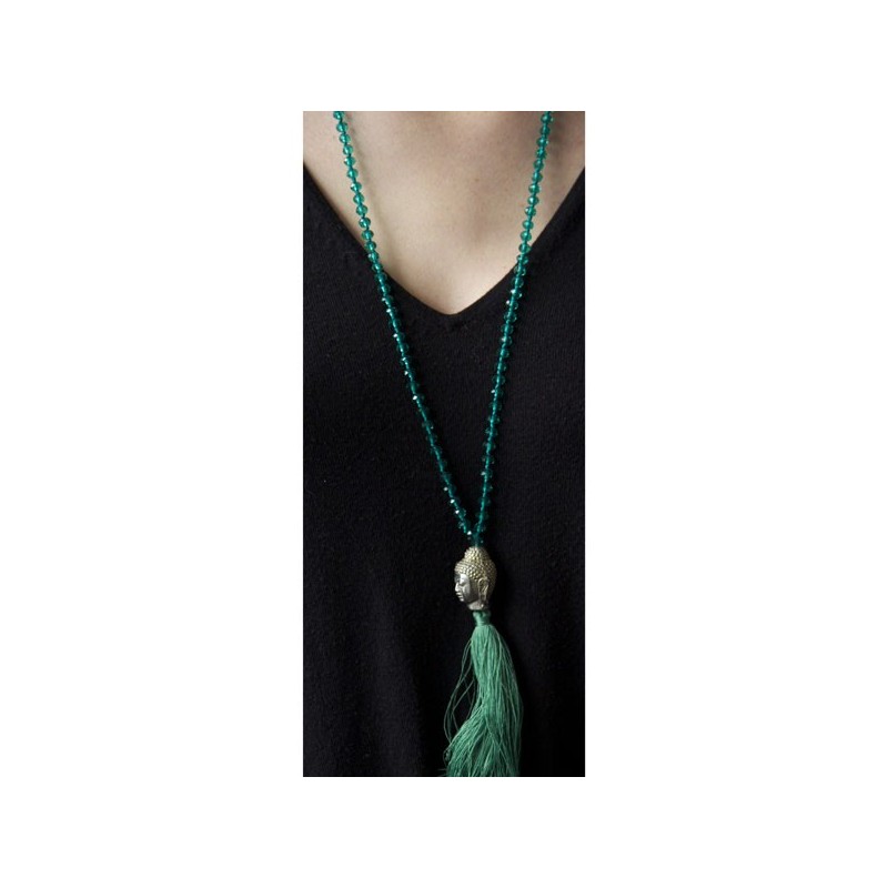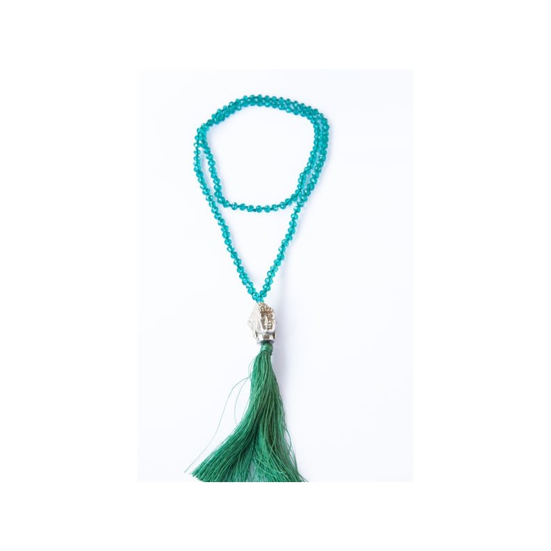 Ce superbe collier en perles translucides vertes avec son Buddha en argent et pompon vert est empreint de spiritualité. Entièrement réalisé à la main à Bali, il nous a conquise car il est simple, original et chic à la fois. Ce collier, inspiré du chapelet bouddhiste, nous rappelle que la sagesse s'atteint après un certain éveil ou état appelé nirvana et dont on peut dire qu'il est bienheureux. A offrir à une personne à qui l'on veut du bien ou à s'offrir afin de se rappeler que Buddha peut nous aider à atteindre la sagesse en méditant régulièrement. Et pour toutes les fans du film Eat, Pray, Love (Mange, prie, aime) avec Julia Roberts il sera idéal puisqu'elle en porte un. Idée de cadeau de Noël ou d'anniversaire.