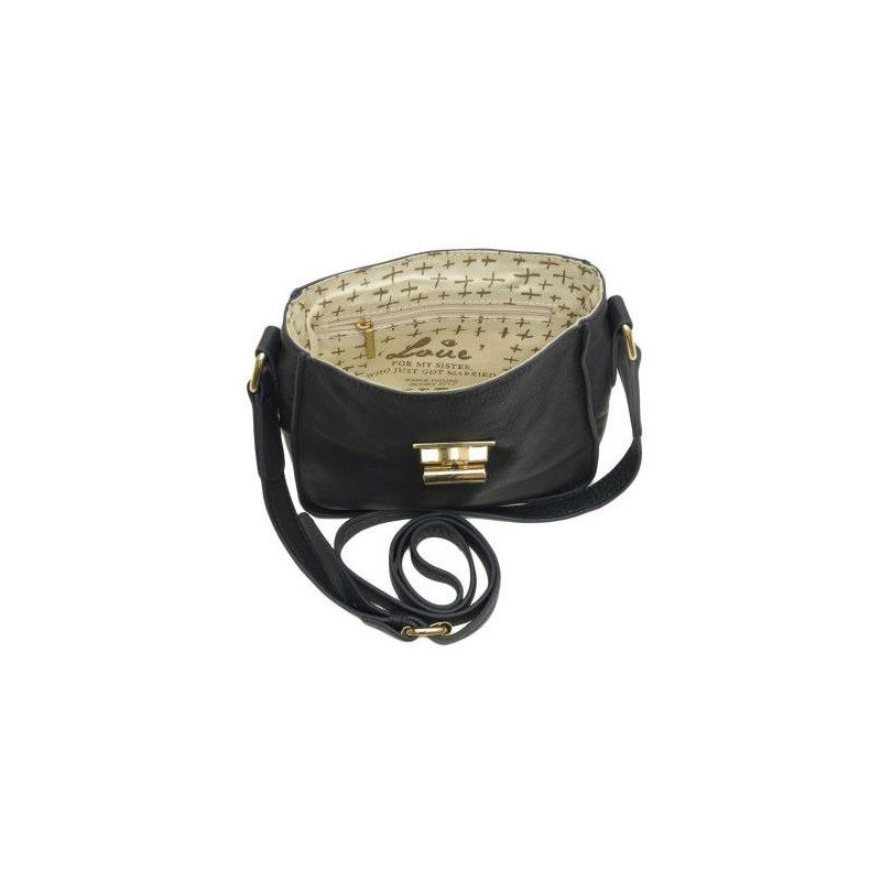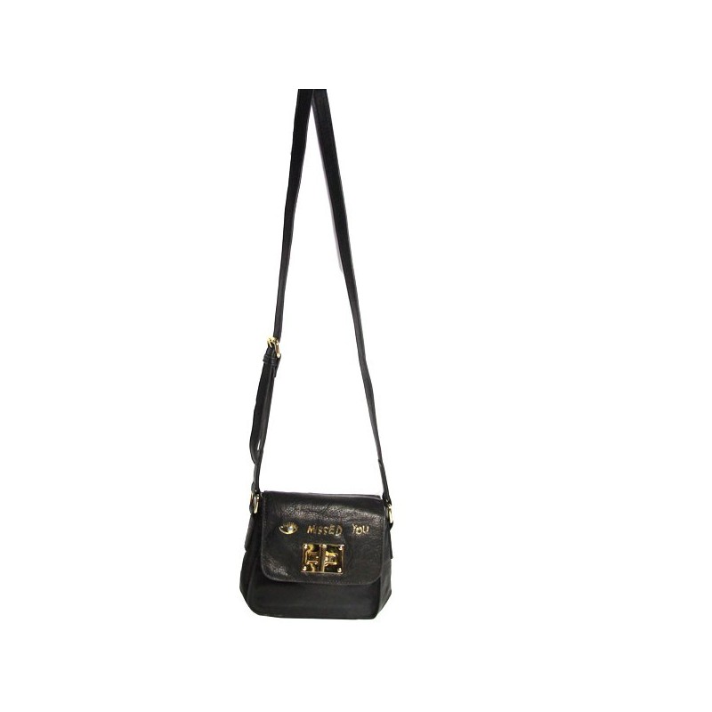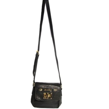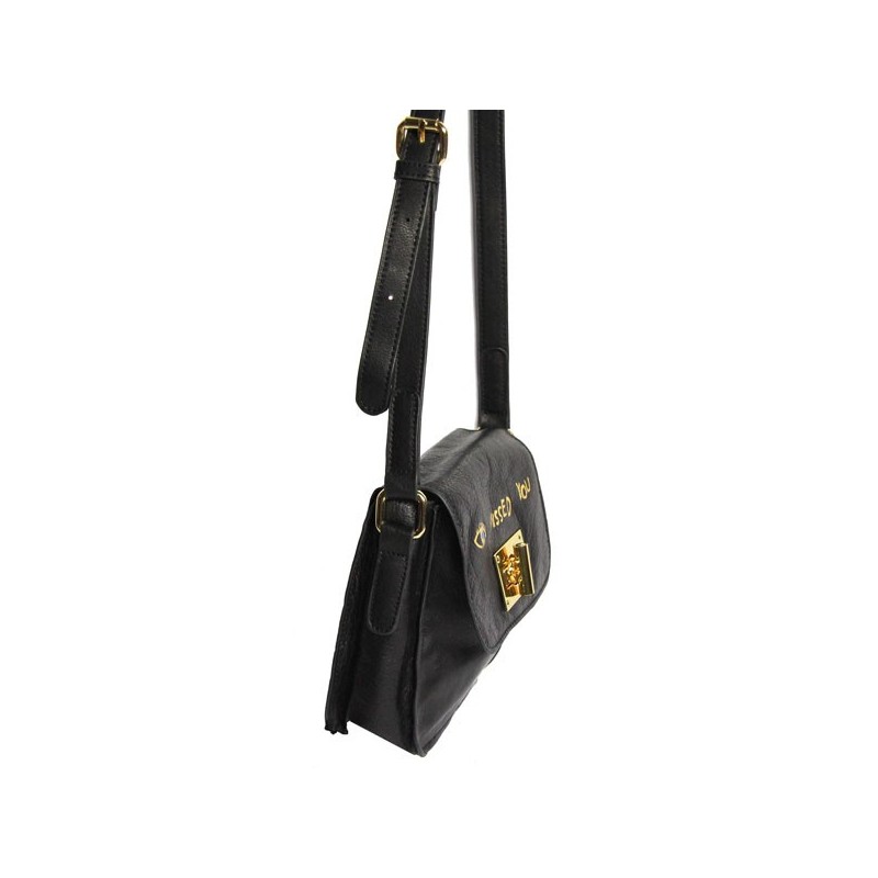This ultra trendy black leather bag is also full or humor with its golden writing and its blue eye!