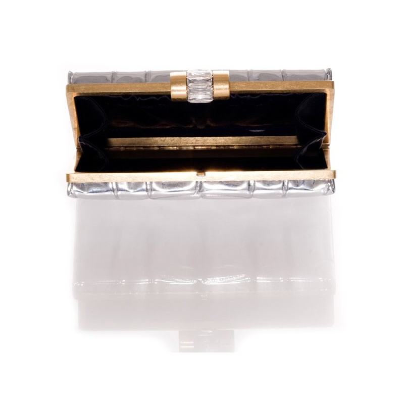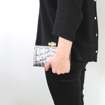 This second-hand minaudière from Yves Saint Laurent in crocodile-style patent leather in silver is in perfect condition. A mini evening purse for a wedding or cocktail party. This minaudière will hold your lipstick and your keys, it's a mini format. An iPhone-type cell phone will not fit.