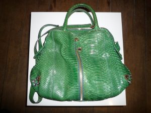 Son sac du jour est le modèle Voyou de la maison Sonia Rykiel en python vert acidulé. Trop beau. Je l’adore et ai d’ailleurs essayé de lui voler plusieurs fois. Un collector.