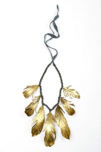 – Exotic jungle. Coloris : acide, kiwi, bambou, liane, orchidée. Matières : plumes, rubans, paille, perles et pierres multicolores, strass, fleurs textiles, résine aux effets changeants. Et nous aurons de grands colliers ornés de plumes, des bracelets lianes, des broches insectes et des bagues fleurs.