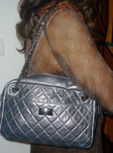 Le sac qu’elle portait est le modèle XXXX Chanel en cuir matelassé métallisé argent, so chic. Je l’adore et ai failli lui voler. C’est décidé la prochaine fois, je lui volerai !