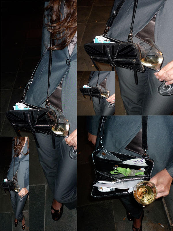 Qu’avait-elle dans son sac « Clash » de Jean-Charles de Castelbajac représentant l’Union Jack d’un mélange de cuirs noirs lisse et vernis ?