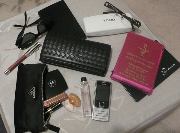 Il regne un tel désordre aussi dans mes sacs, j’en ai aussi des rouges à lèvres, mon porte-feuilles, mon porte papiers, mon porte-monnaie, des clés des apparts où j´habite, mon maquilage Chanel, bien sûr, un livre, pour lire , toujours en français, enfin…je suis heureuse, parce que j’en ai un Birkin, et ce n’est plus un rêve pour moi, grace a Dieu..mais, Dieu merci, j’en ai encore d’autres rêves qui s’appellent Kelly, et d’utres, encore…