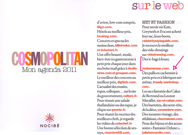 Grande nouvelle, l’Agenda 2011 de Cosmopolitan est paru aujourd’hui et devinez quoi ? matemonsac.localhost.com fait partie des « Bonnes adresses » dans la catégorie « Net et Fashion ».