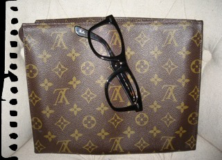 Une pochette en toile monogramme de Louis Vuitton dans laquelle elle met un peu de tout ! et nous y a accroché ses jolies lunettes très tendance pour l’occasion.