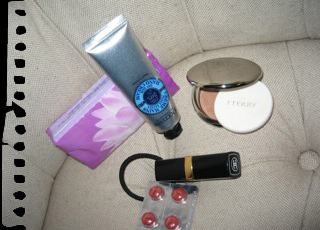 Des mouchoirs en papier en cas de rhume. Sa crème pour les mains de l’Occitane, sa poudre « Terry » de By Terry (une excellente marque de maquilage) pour les retouches beauté, son baume pour les lèvres de Chanel, un élastique pour ses longs cheveux quand elle ne les supporte plus et enfin des cachets pour la tête (elle est prévoyante Julia !).