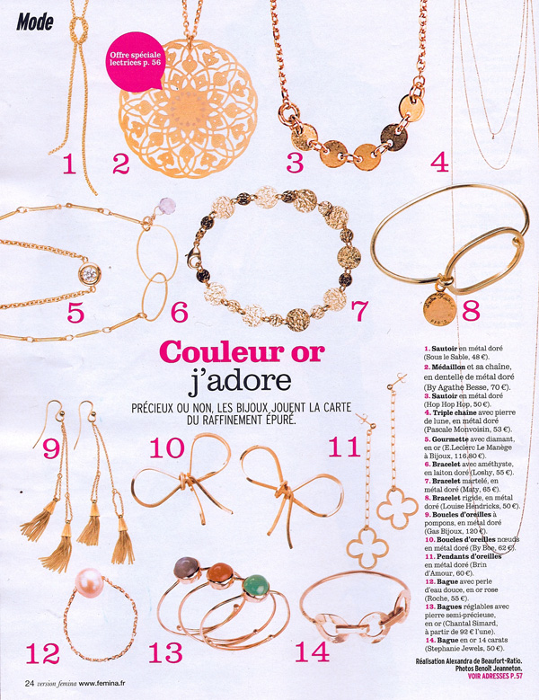 Je suis très heureuse de vous annoncer que la créatrice Loshy dont je distribue les bijoux sur mon site matemonsac.localhost.com a été sélectionnée par le Version Femina du 11 décembre 2010 pour sa page Bijoux « Couleur or j’adore ».