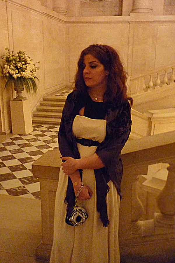 Aujourd’hui j’ai le plaisir de vous présenter Leila, une de mes clientes qui a loué une minaudière Valentino, un véritable bijou de sac ou sac-bijou pour se rendre au Dîner des Grands Chefs à Versailles ! Cette minaudière en satin de soie (pochette Valentino) est entièrement rebrodée de perles et de strass Swarovski©. Son anse se porte tel un bracelet qui est lui aussi entièrement pavé de strass Swarovski©. En un mot, elle est sublime. Un sac de luxe qui vous transforme en princesse le temps d’une soirée…
