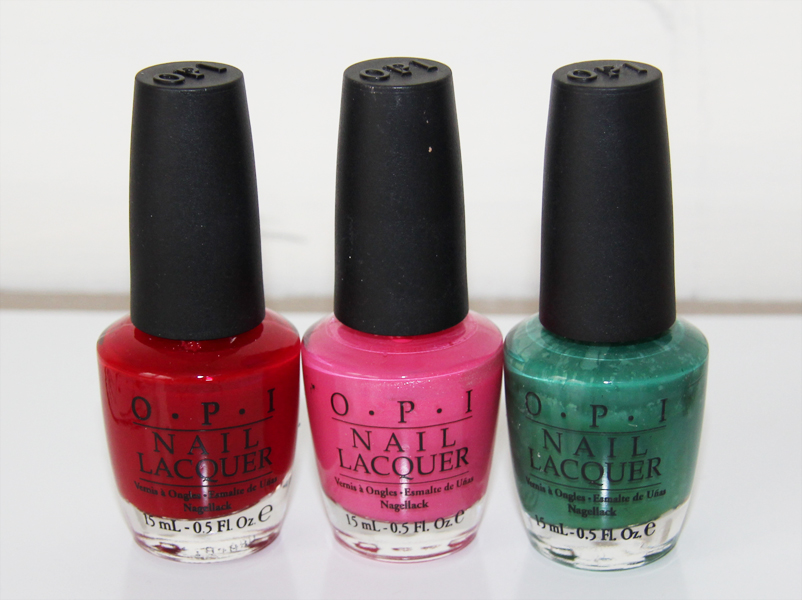 Mes vernis OPI : Vodka & Caviar (rouge intense), Flower-to-Flower (rose flashy), Jade is the new black (vert foncé).