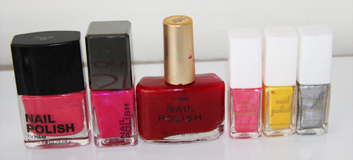 Mes vernis H&M : (de gauche à droite) Check Me Out (un rouge rosé), Material Girl (rose fuchsia) moi superficielle ?!! 🙂, rouge (édition Noël), trio de mini vernis collection été 2012 : jaune, argenté, corail.