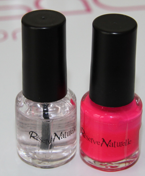 Mes vernis Réserve Naturelle : transparent pour fixer le vernis et rose fluo (qui s’accorde parfaitement avec le bracelet Nilaï Peace and Love !).