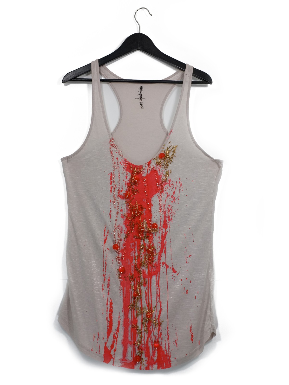 Un t-shirt basique a été utilisé puis peint au mug et brodé à la main de perles de verre et résine.