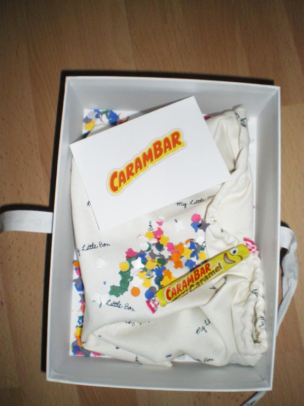 Une fois les livrets et cartes postales retirés, le suspens est toujours intact : les produits sont emballés dans un pochon. On découvre de nombreux confettis et trois Carambars ainsi qu’un autocollant, sympa !