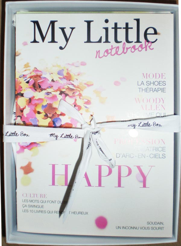 Tout d’abord, quand on l’ouvre, bonne surprise : un joli nœud à ouvrir et découverte du »notebook » My Little Box, un petit livret qui donne des conseils pour utiliser les produits contenus dans la box.