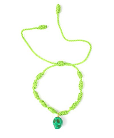 Ce bracelet est une création Mono, une marque espagnole basée à Barcelone qui fait des bracelets aux vertus bienfaisantes (chaque couleur à une signification). Il existe en coton tout simple avec une croix tressée ou avec une tête de mort en pierre howlit.