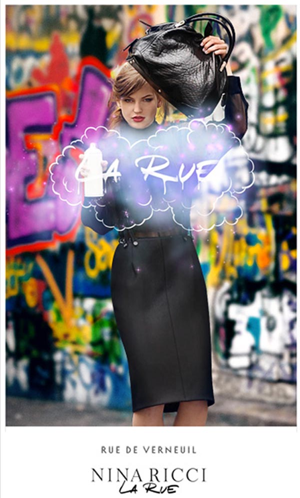 Nina Ricci, résolument moderne et sensible, tant dans sa création que dans sa communication, s’est alliée à l’illustratrice anglaise afin de proposer une série de « Gif Art », afin de célébrer le lancement de son produit phare « La Rue » (issu de la collection Automne/Hiver 12-13).