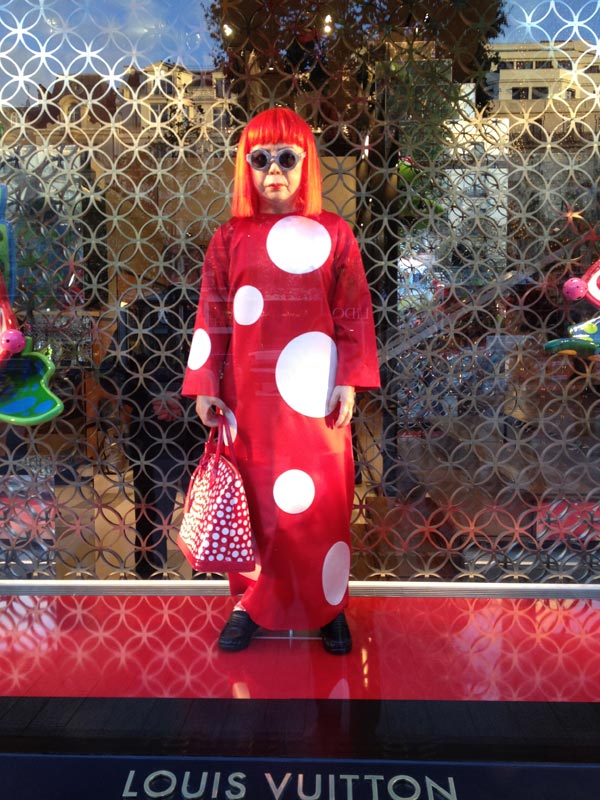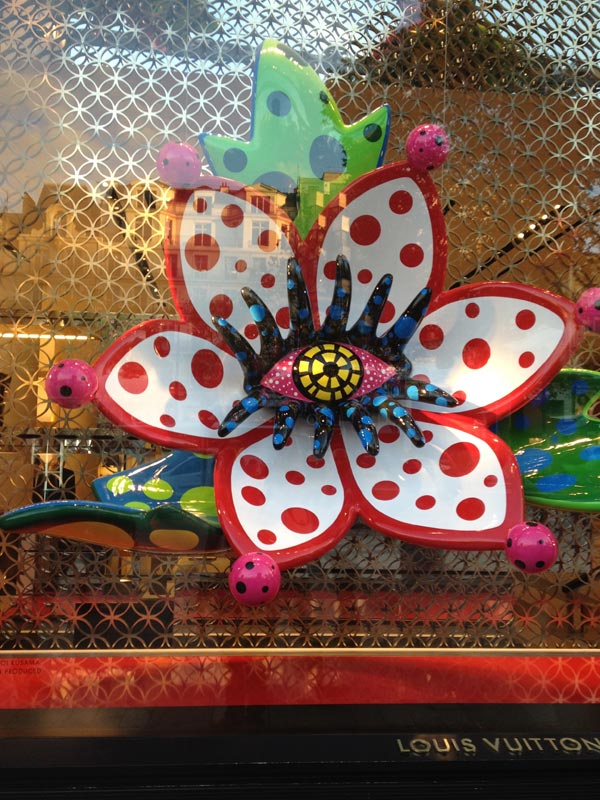 Les étonnantes vitrines reprennent ses codes couleurs blanc et rouge et l’infinité des motifs à pois auxquels s’ajoutent divers éléments tels que des fleurs géantes, des tentacules de poulpes ou encore des mannequins statiques à l’effigie de Yayoi Kusama.
