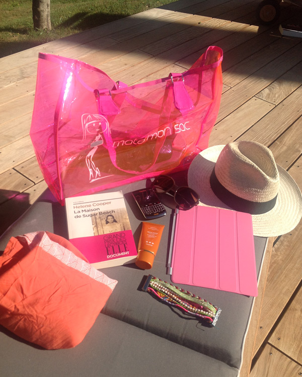 Et si pendant l’année son sac pèse lourd tellement il est chargé, en vacances elle adopte une vision plus minimaliste en emportant avec elle uniquement l’essentiel au bord de la piscine !