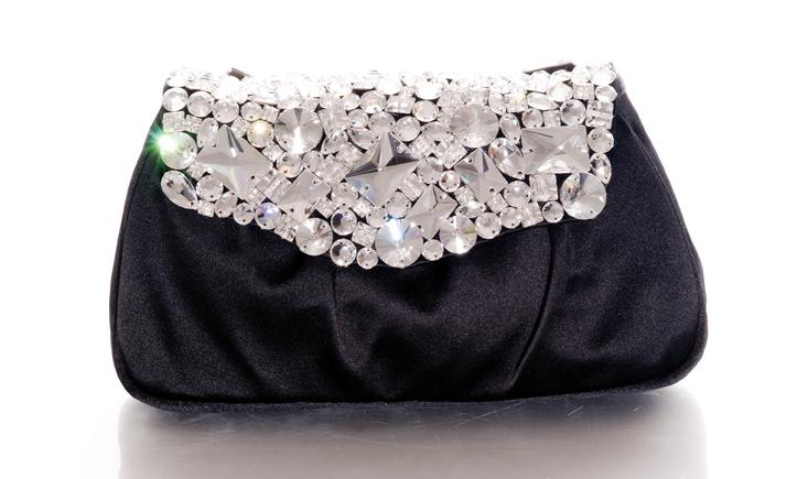 – La pochette du soir Yves Saint Laurent en satin de soie noir et ses strass blancs Swarovski qui illumineront votre robe noire.