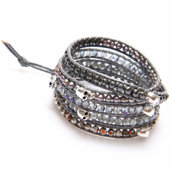 Nakamol bracelet wrap perles grises et argentés et tête de mort
