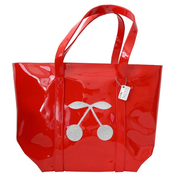 Elle a tenu à présenter son sac préféré : le cabas school Anne-Charlotte Goutal rouge et blanc à motif cerises dont raffolent toutes ses copines !