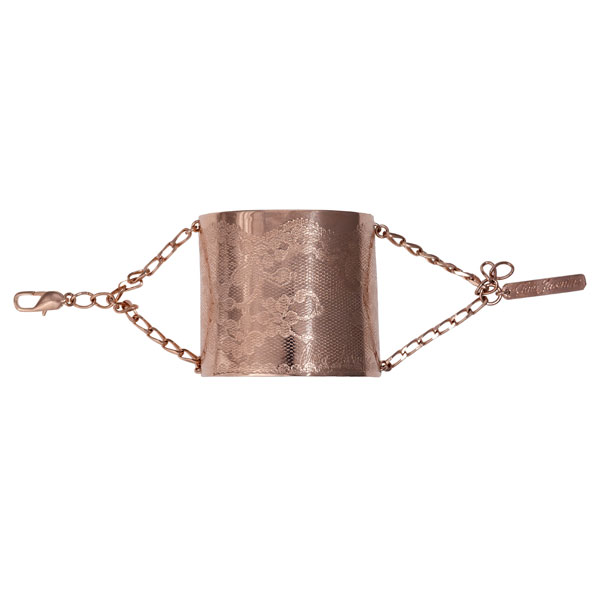 A son bras, Fabienne porte un sublime bracelet manchette de Clara Jasmine. Avec sa gravure de dentelle fine, ce bracelet manchette de Clara Jasmine habille parfaitement la belle robe blanche de Fabienne.