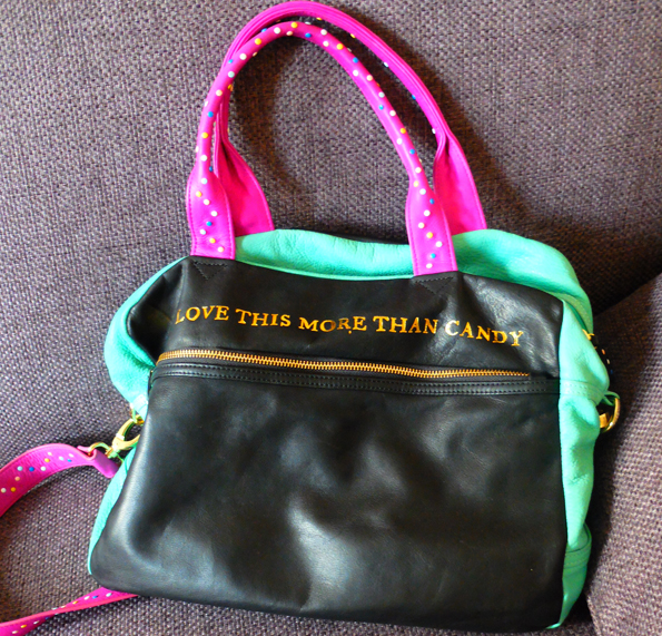 C’est un sac en cuir multicolore dont les anses ont des clous également multicolores d’où son nom le « Candy » car il est beau comme un véritable bonbon. La qualité de son cuir est impressionnante tant il est doux et résistant. C’est également la raison pour laquelle elle met en avant cette marque qu’elle affectionne particulièrement. Ses messages sont drôles et favorisent le contact car les gens qui sont autour de vous ont envie de vous parler lorsqu’ils voient votre sac ou votre portefeuille…