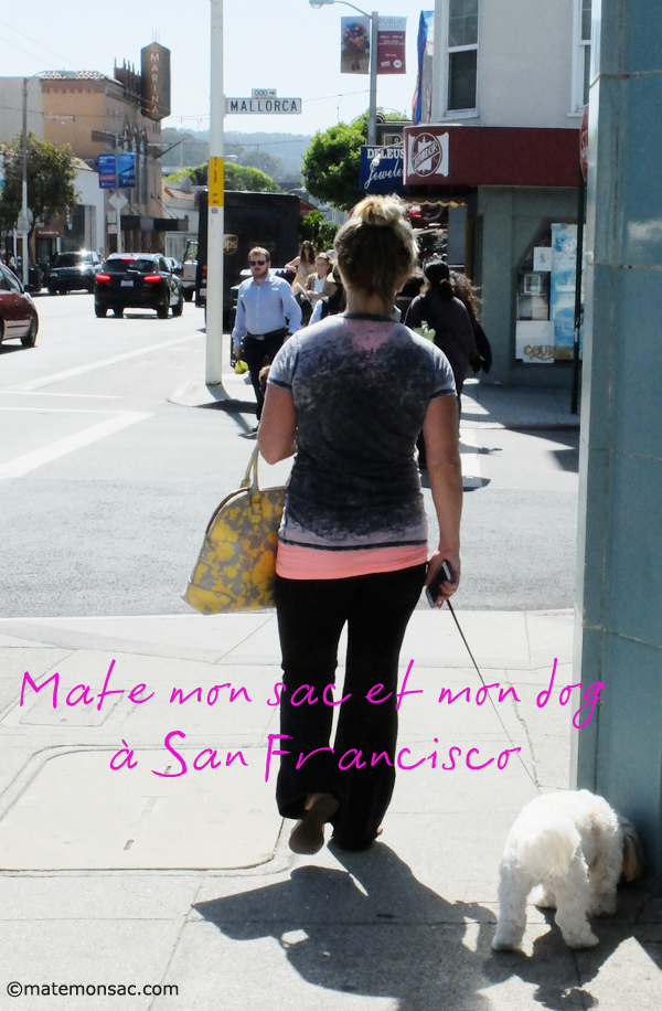 Look du jour : le doggy bag (ou sac à chien, beaucoup moins glamour dans sa version française) avec un vrai dog à l’intérieur, ou pet devrions-nous dire puisque nous sommes en Californie dans les rues de San Francisco comme toutes les photos précédentes de la semaine.