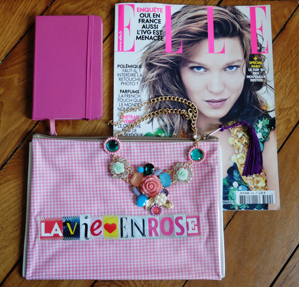 Chapeau de paille pour se protéger du soleil, son livre, son magazine ELLE, ses lunettes solaires et son étui, ses pochettes en tissu rose. Bref, ses objets indispensables pour aller à la plage.