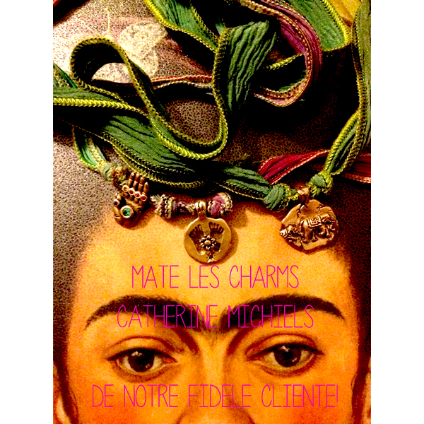Matemonsac a eu le plaisir de recevoir ce très joli tableau de la part de notre fidèle cliente Simona! C’est sur le front de Frida Kahlo qu’elle a décidé d’exposer son bracelet et ses charms de Catherine Michiels. Elle a fait l’alliance de trois charms , le buddha’s feet, la buddha’s hand et une Mathilda en bronze, le tout monté sur un fil de soie vert et rouge.