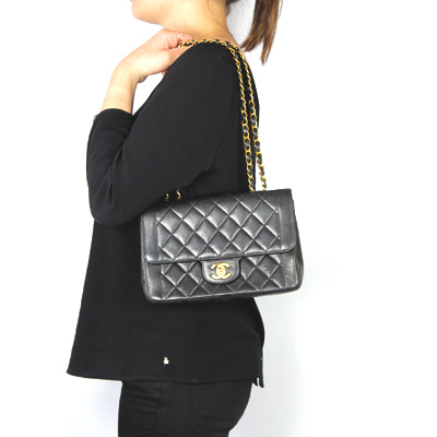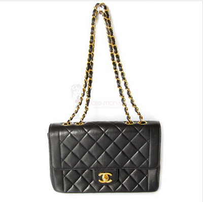 Chanel, son sac matelassé indémodable en agneau noir avec sa chaîne bandoulière dorée :