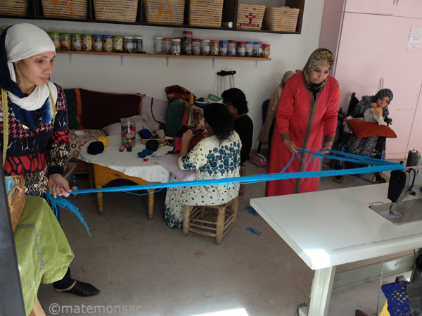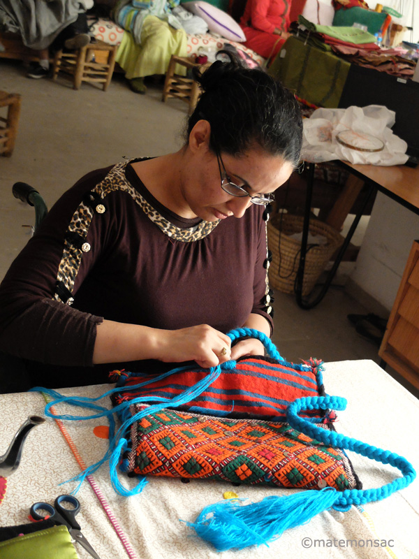 Ces femmes travaillent au Maroc dans un atelier qui rassemblent des femmes souffrant de handicap. Il s’agit d’une formidable association qui aide ces femmes. Elle leur apprendre le travail de brodeuses et couturières. Elle leur donne également accès à de nombreux soins et aides. En les faisant travailler nous aidons cette association et vous, en achetant nos pochettes vous les aidez à votre tour.