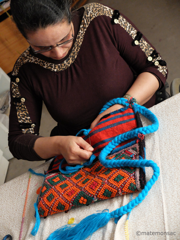 Ces femmes transforment pour nous d’anciens coussins Kilim, de réelles pièces vintage que nous chinons une à une dans les souks marocains, en véritables pochettes uniques. Les Pochettes Kilim handmade with love and care by Matemonsac !