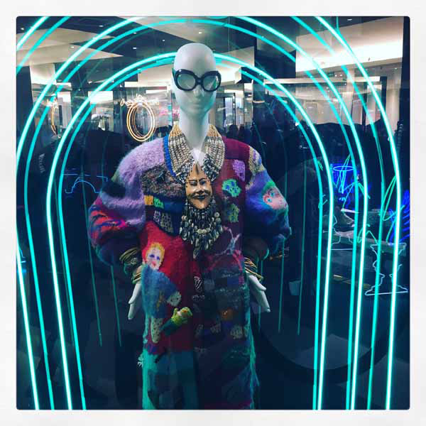Depuis des décennies, Iris Apfel a amassé une collection de vêtements des plus grands designers du XXe siècle, qui remplissent deux étages de son appartement de Park Avenue. Vous rêvez d’avoir la même chose chez vous ? Nous aussi !! C’est ainsi qu’elle peut se permettre de ne jamais porter deux fois la même chose comme le dit d’elle le designer belge Dries Van Noten (que nous admirons aussi !). Il est vrai qu’il ose aussi les mélanges d’imprimés, de couleurs et de matières comme elle le fait.