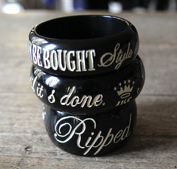 Enfin, ses poignets sont toujours couverts d’une collection de bracelets et joncs plus ou moins volumineux et colorés. Voici ce que nous proposons afin de créer votre propre assortiment de bracelets !Les bracelets de la créatrice américaine Jessica Kagan Cushman sont parfaits avec leur message gravé dans de la résine peinte à la main :