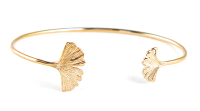 Elle a choisi le collier Apache, le bracelet Gingko et le jonc plaqué or version XXL avec son lien en cuir doré.