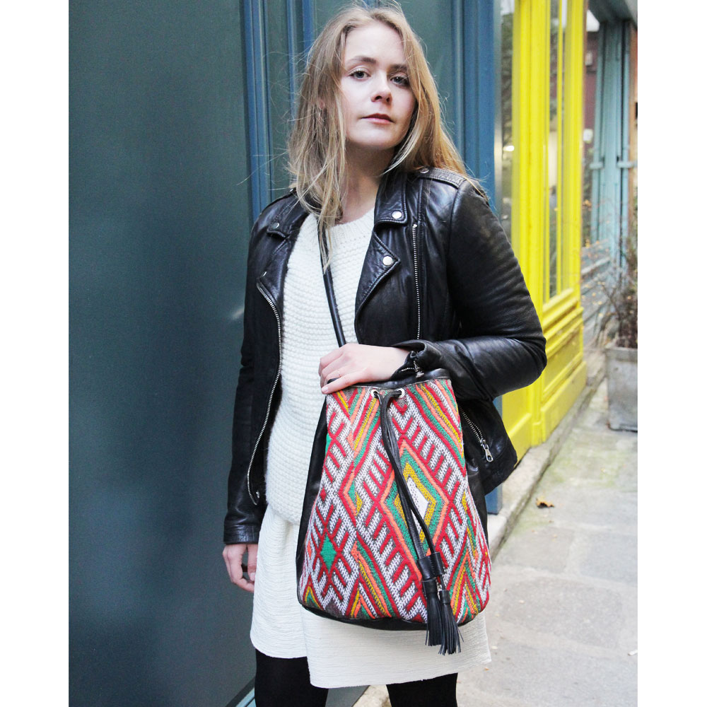 Ce sac seau kilim est unique: il est fabriqué à la main, et fait de kilim ancien et de cuir véritable. Authentique, ce sac évoque l’esprit des tribus berbères du Maroc conjugué à la mode parisienne.