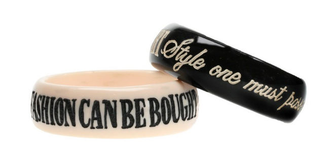 Un peu d’humour ne fait pas de mal, pour les rigolotes optez pour ces bracelets Jessica Kagan Cushman. Ces bijoux affichent un message écrit à la main, « Fashion can be bought but style one must possess » qui leur plaira à tous les coups!