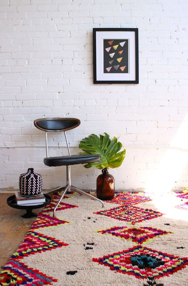 Le blanc au mur et au sol illumine et agrandit les pièces, mais celles-ci peuvent finir par sembler froides. Pour remédier à cela, rien ne vaut un tapis berbère ! La preuve en image: