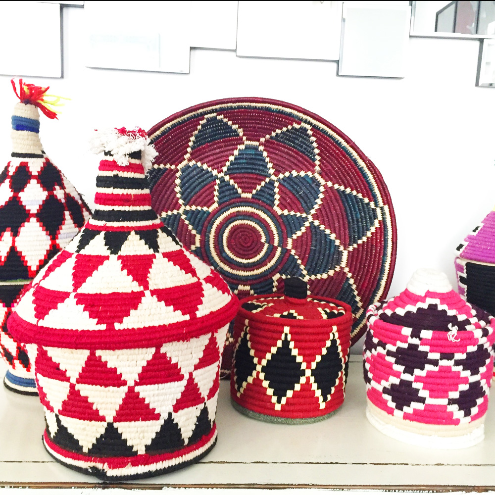 Ici on a créé une fresque murale en accrochant diverses corbeilles berbères.