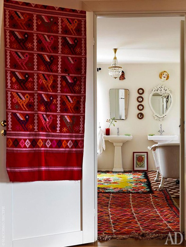 Un autre exemple de mélange des genres: une salle de bain classique – baignoire à pieds, lustre… – est personnalisée avec des tapis ethniques colorés. Décalé mais réussi !