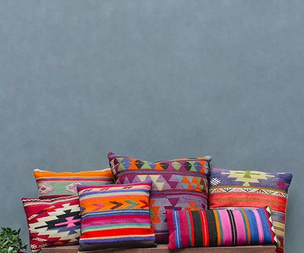 Il faut oser les mélanges de matières et motifs pour réussir une décoration bohème. Mixer des coussins kilim avec d’autres rayés en toile berbère par exemple.