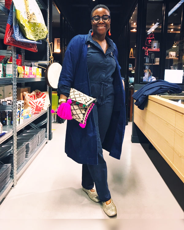Aline est en effet une parisienne qui sort des sentiers battus ! On adore son style des plus original. Ici elle porte ici une combinaison bleu marine et réveille sa tenue avec une pochette unique Maud Fourier Paris en kilim et son pompon rose fuchsia. Quel style !!
