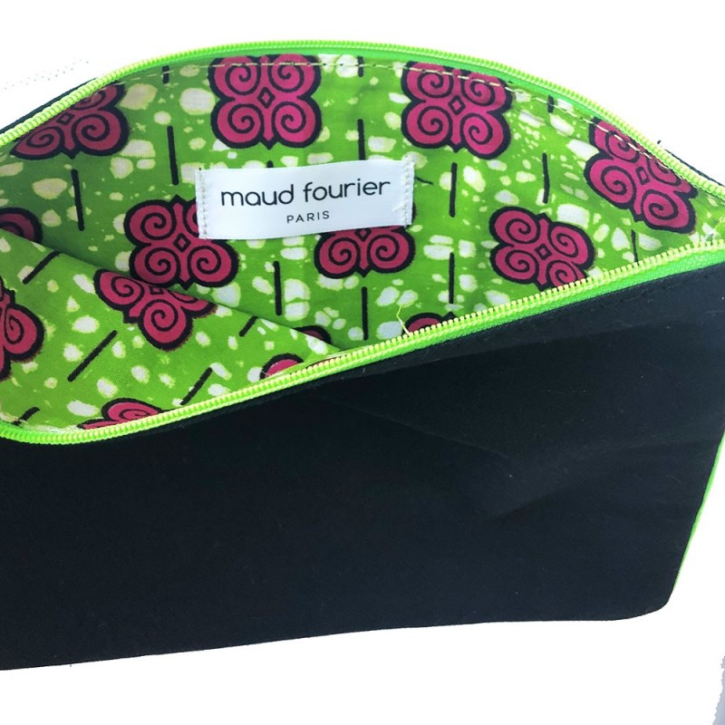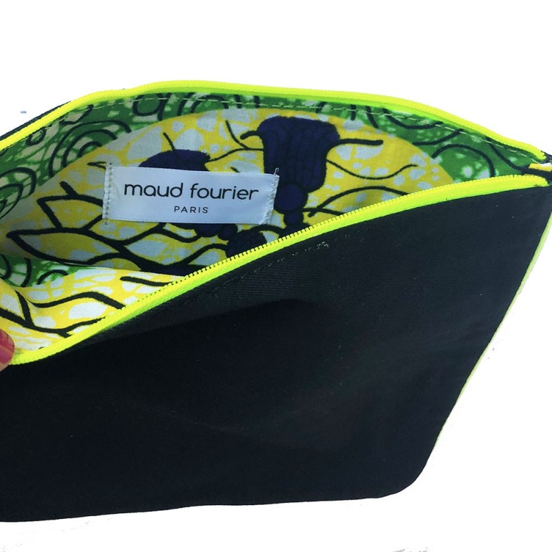 Détails : Double anses de 70 cm pour un porter épaule. Doublé de coton imprimé wax. Fermerture par zip fluo dont le coloris est à choisir. Détails passepoil fluo sur les côtés. Transfert glitter argent.