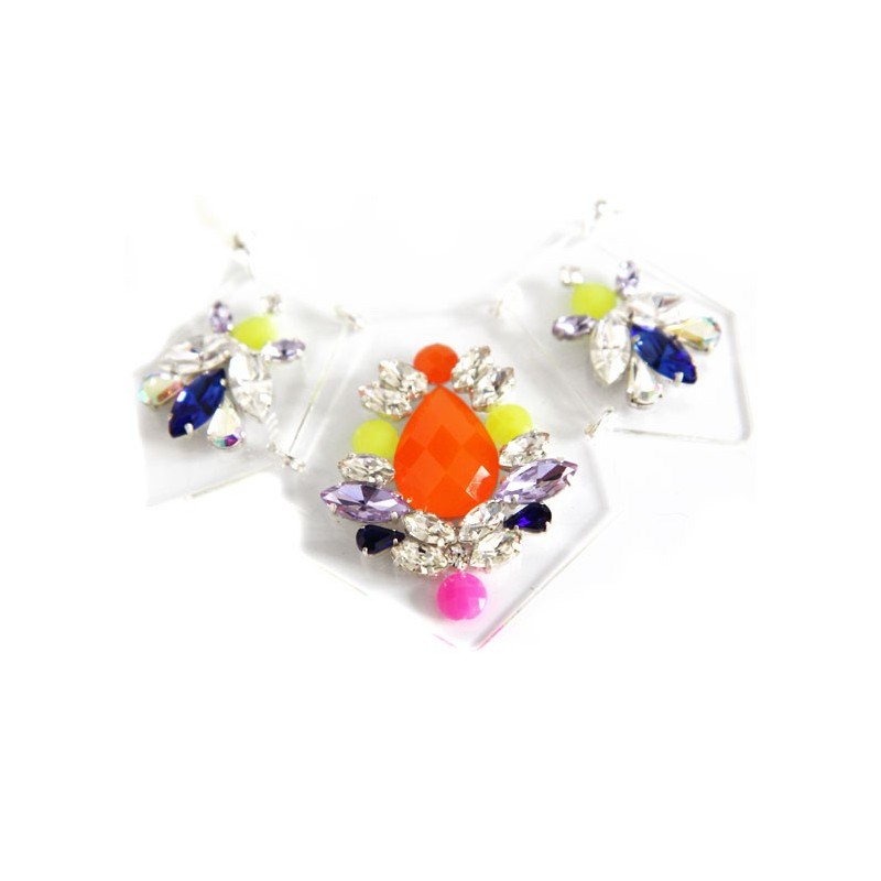 Zayn, une créatrice tunisienne, a créé un superbe collier sur plexiglas et strass multicolores.